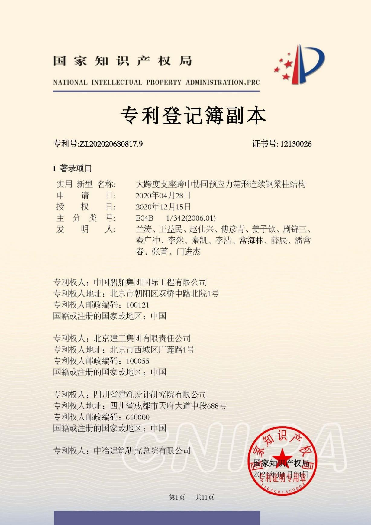 今年6月,國家知識產(chǎn)權(quán)局公布第二十五屆中國專利獎授獎決定,由中船集團(tuán)旗下中船國際工程主導(dǎo)申報的專利《大跨度支座跨中協(xié)同預(yù)應(yīng)力箱形連續(xù)鋼梁柱結(jié)構(gòu)》(專利號:ZL202020680817.9)榮獲本屆中國專利銀獎。該獎項(xiàng)由國家知識產(chǎn)權(quán)局與世界知識產(chǎn)權(quán)組織聯(lián)合設(shè)立,是我國專利領(lǐng)域的最高榮譽(yù)。今天,讓我們走進(jìn)中船國際工程鋼結(jié)構(gòu)工程設(shè)計與研發(fā)團(tuán)隊(duì),聆聽他們的奮斗故事。