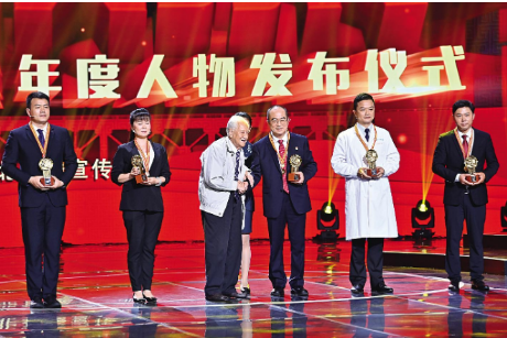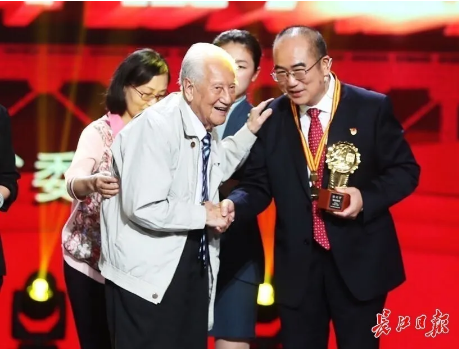 當95歲高齡的黃老出現在舞臺上時,張定宇快步向前迎接,這一幕令人動容。黃老在攙扶下,為張定宇戴上獎章,“能為你頒獎,我感到很榮幸。你是祖國的驕傲,人民的英雄!”