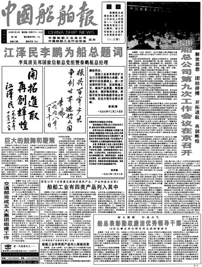 1998年1月16日,《中國船舶報(bào)》報(bào)道江澤民、李鵬為中國船舶工業(yè)總公司題詞。