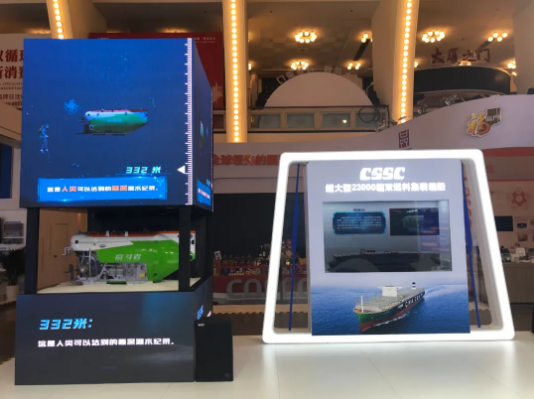 進入中國船舶展廳,觀眾不僅能夠看到“奮斗者”號全海深載人潛水器、“雪龍2”號極地科考船等多個高科技品牌產品,還可以通過航空母艦、常規動力潛艇、驅逐艦、護衛艦模型了解我國國防裝備實力。