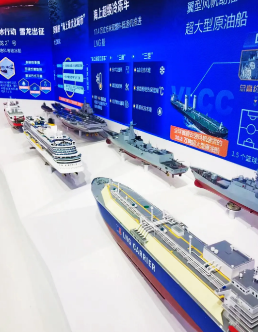 這次中國船舶集團展區以“向海圖強,創新引領”為主題,以“全面建設世界一流船舶集團”的戰略目標和“引領行業發展、支撐國防建設、服務國家戰略”的企業使命為主線,圍繞具有代表性、突破性、標志性、引領性的自主品牌,以及高質量裝備和工程項目,全面展示集團公司在穩定經濟發展、帶動科技創新、服務民生保障、推動中國制造走向世界進程中所取得的成就。