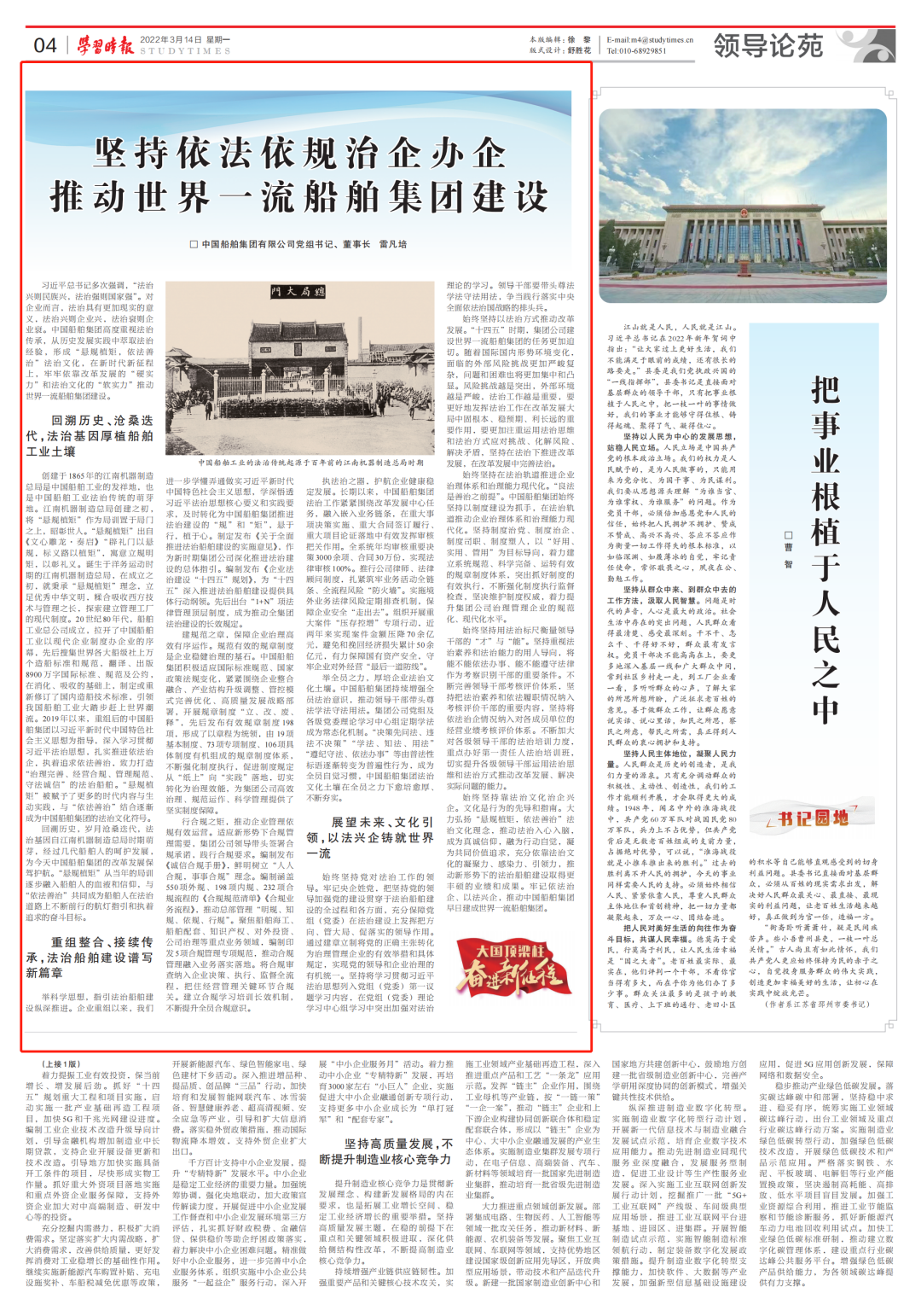 3月14日,《學(xué)習(xí)時報》刊發(fā)中國船舶集團(tuán)有限公司黨組書記、董事長雷凡培的署名文章《堅(jiān)持依法依規(guī)治企辦企 推動世界一流船舶集團(tuán)建設(shè)》,全文如下: