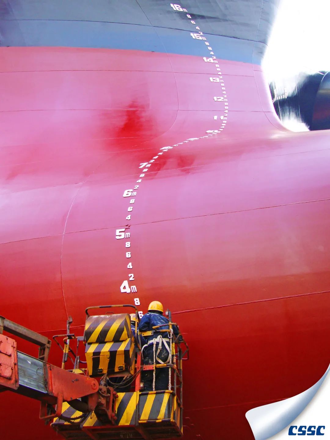 該片拍攝于中船澄西金山塢內MARITIME VANESSA (HONGKONG) 船進塢油漆涂裝和螺旋槳修理作業時,創作主要利用船舶與現場作業人物大小形成超大反差,以獨特的視角展現了涂裝后新船的雄偉和迷人色彩。