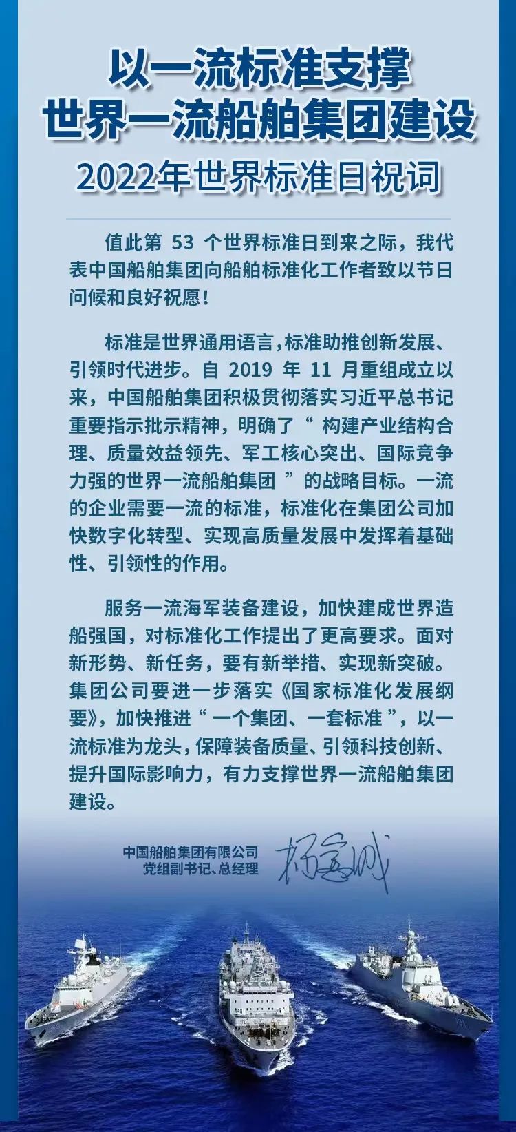 10月14日,中國船舶集團舉行第53屆世界標準日主題活動,主題為“以一流標準支撐世界一流船舶集團建設”