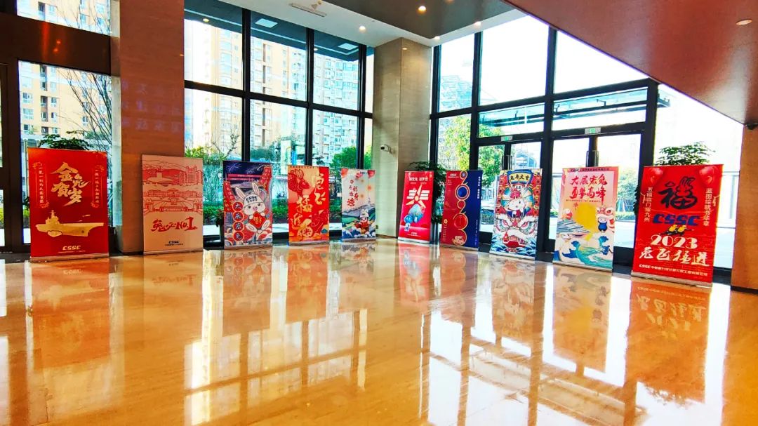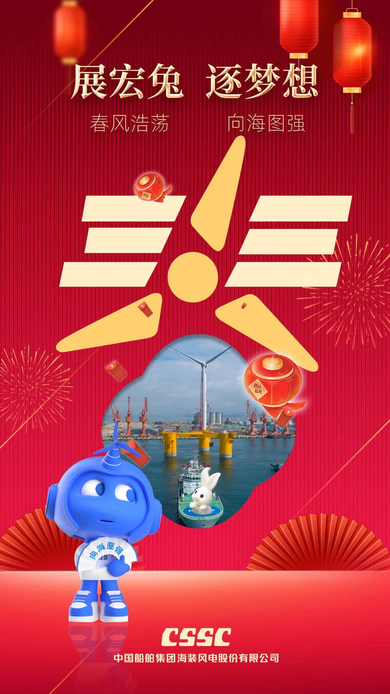 海報主體部分以國內(nèi)首臺深遠(yuǎn)海浮式風(fēng)電裝備“扶搖號”為創(chuàng)意點,通過含有“大風(fēng)車”形象的寫意“春”字,表達(dá)中船海裝將在春風(fēng)浩蕩中大展宏“兔”,在向海圖強征程中矢志奮斗!