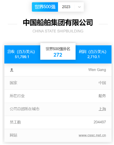 北京時間2023年8月2日,《財富》中英文網站同時發布2023《財富》世界500強排行榜,中國船舶集團有限公司以517.991億美元的營業收入位列全球榜單第272位,自2021年重組后首次申報以來連續三年上榜,蟬聯全球造船企業首位。