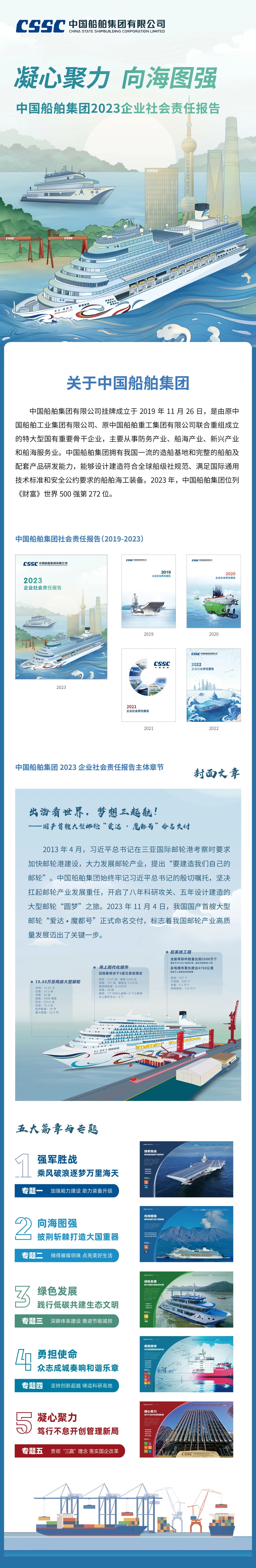 近日,中國船舶集團有限公司發布了《2023企業社會責任報告》(以下簡稱《報告》)。本報告是中國船舶集團正式發布的第五份企業社會責任報告。