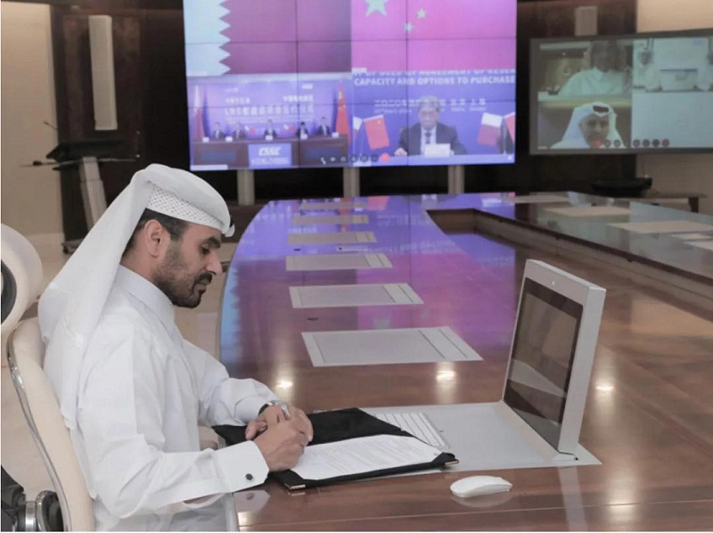????雖然全球疫情持續(xù)蔓延,但“一帶一路”建設(shè)的步伐并未停滯。4月22日,中國船舶集團(tuán)有限公司與卡塔爾石油公司在中國北京、上海及卡塔爾多哈三地以“云簽約”方式聯(lián)合簽署“中國船舶—卡塔爾石油液化天然氣(LNG)船建造項目”協(xié)議,所涉訂單總金額超過200億元人民幣。這是卡塔爾天然氣項目首批訂單,也是中國船企迄今承接的金額最大的造船出口訂單。中國船舶集團(tuán)董事長雷凡培、卡塔爾能源事務(wù)部長兼卡塔爾石油總裁薩阿德?謝里達(dá)?阿爾卡比出席簽約儀式并分別代表雙方在協(xié)議文本上簽字,中國船舶集團(tuán)副總經(jīng)理孫偉主持簽約儀式,卡塔爾天然氣公司首席執(zhí)行官卡利德?阿爾?塞尼、卡塔爾石油商務(wù)開發(fā)執(zhí)行副總裁賈西姆?阿爾馬拉祖齊等出席簽約儀式。