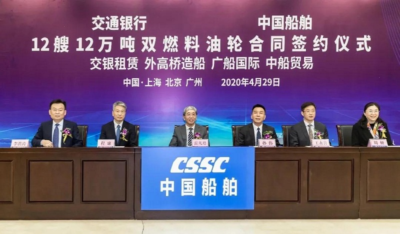 ????4月29日,中國船舶集團(tuán)有限公司旗下中國船舶工業(yè)貿(mào)易有限公司、上海外高橋造船有限公司、廣船國際有限公司與交通銀行股份有限公司旗下交銀金融租賃有限責(zé)任公司在北京、上海、廣州三地以“云簽約”方式簽署12艘12萬噸雙燃料油船建造合同,合同總金額約46億元人民幣,這是中國船舶集團(tuán)旗下單位近期承接的又一單筆大額訂單。中國船舶集團(tuán)黨組書記、董事長(zhǎng)雷凡培,交通銀行黨委書記、董事長(zhǎng)任德奇,中國船舶集團(tuán)黨組成員、副總經(jīng)理孫偉,交通銀行黨委委員、副行長(zhǎng)呂家進(jìn)出席簽約儀式。