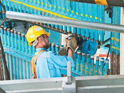 一名中國施工人員正在進行鍋爐受熱面打磨對口作業(yè)。本報記者 劉 剛攝