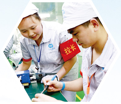 華鎣市一家企業的生產線負責人唐定燕(左),向徒弟講解生產技術。周松林攝