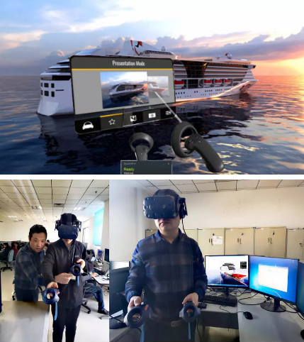 ????該平臺(tái)通過總體總師與三維造型師的協(xié)同交互,完成全船三維設(shè)計(jì)(全船造型和艙室內(nèi)部裝飾等)并搭建逼真場(chǎng)景,用戶通過穿戴智能頭顯,操縱控制手柄,真正實(shí)現(xiàn)了“漫步甲板、穿行船艙”的自主漫游體驗(yàn)。