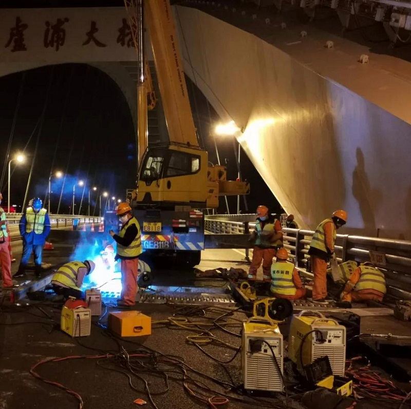 ????此時,來自中國船舶集團所屬上海盧浦大橋投資發展有限公司的守橋人開工了。近20平方米的施工區域,人頭攢動、焊花飛舞,工人身著的安全背心泛出的熒光,焊槍下閃爍的弧光和橋面的燈光交相輝映。