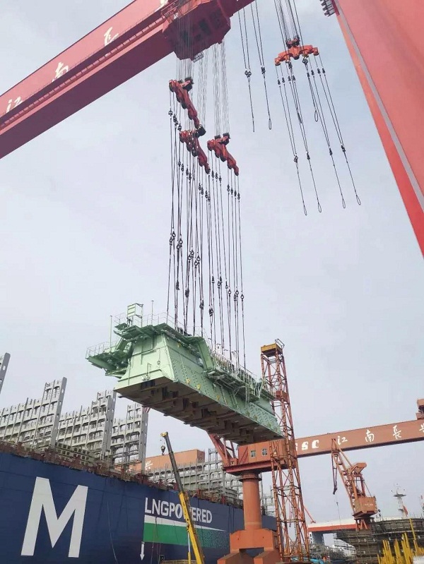 全球最大雙燃料集裝箱船主機吊裝完成!中國船舶所屬江南造船又創紀錄!
