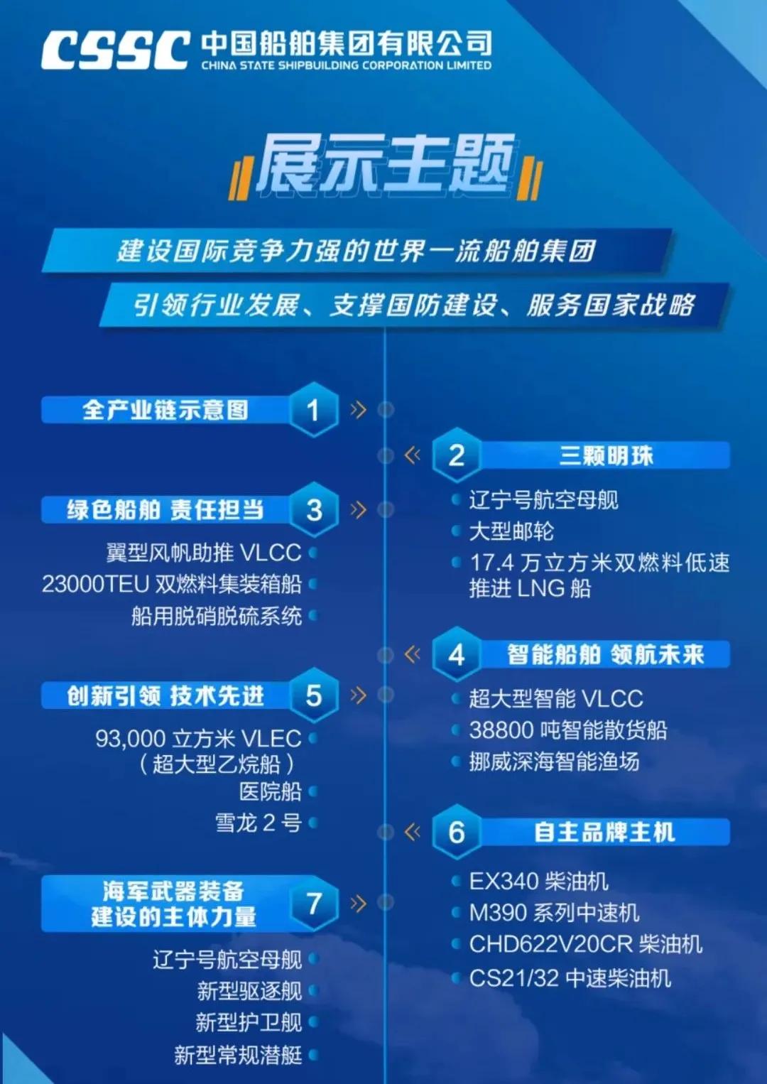 總體展區 中國船舶集團展示了代表著世界造船工業最高水平的航空母艦、大型郵輪、液化天然氣(LNG)船“皇冠上的三顆明珠”,充分彰顯具備設計建造符合全球船級社規范、滿足國際通用技術標準和安全公約要求的產品的能力。圍繞“綠色 智能 創新”主題,特別設置了3個主題展臺,重點展示23000TEU雙燃料集裝箱船、超大型智能超大型油船(VLCC)、挪威深海智能漁場、9.8萬立方米超大型乙烷運輸船(VLEC)、“雪龍2”號等9型產品,彰顯出中國船舶集團貫徹落實“創新、協調、綠色、開放、共享”新發展理念的實踐。