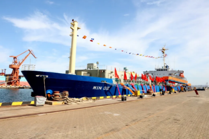 2020年,中國船舶集團旗下大船集團將散貨船改裝而成的“民德”號交付。這是全球首制、具有完全自主知識產權的舷側開孔式養殖工船,具有魚類養殖、餌料加工、活魚運輸等功能。交船的同時,大船集團與東方漁業簽約10+8艘大型養殖工船項目。