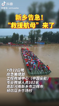 7月24日1時(shí)許,進(jìn)占道路具備重型裝備通行條件,石料也已準(zhǔn)備到位,決口封堵戰(zhàn)正式打響。在封堵現(xiàn)場,前一天在新鄉(xiāng)轉(zhuǎn)移被困群眾時(shí)立下頭功、被稱作“救援航母”的應(yīng)急動(dòng)力舟橋再次出現(xiàn)。