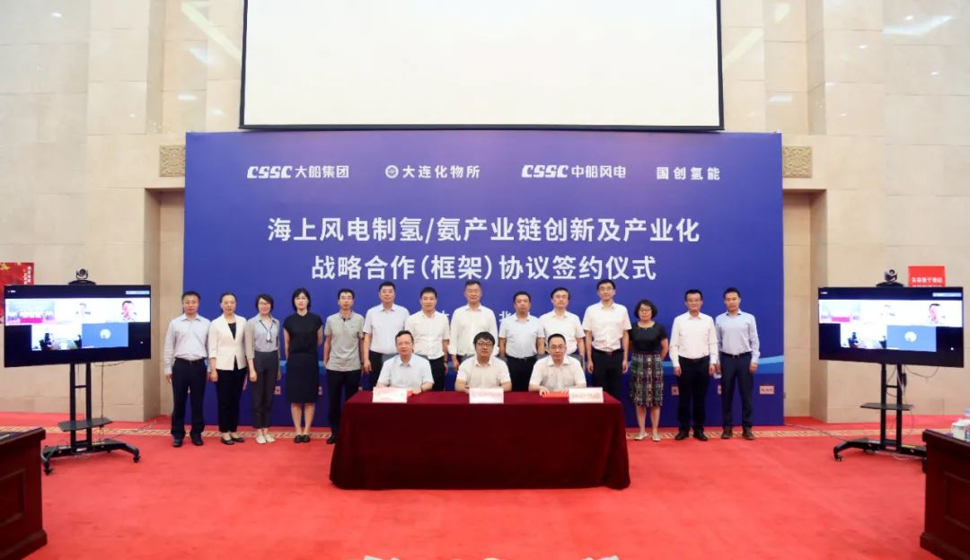 8月6日,中國船舶集團旗下大船集團舉行《海上風電制氫/氨產業鏈創新及產業化戰略合作(框架)協議》簽約儀式。大船集團與大連化物所、國創氫能、中船風電四方代表在協議書上簽字。