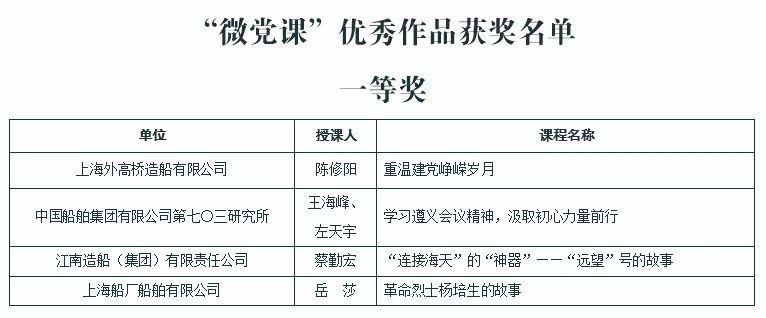 除一等獎的“微黨課”作品,其他獲評優秀的“微黨課”和專題黨課可以登錄集團公司黨校“中船e學”平臺首頁“中國船舶集團有限公司黨課評選優秀作品展示”進行觀看。