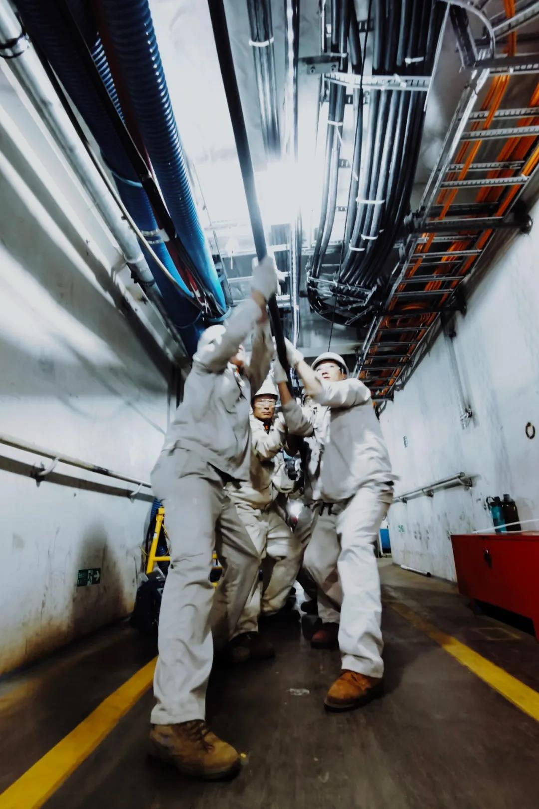 目前已完成全船總段制作和搭載的首制國產大型郵輪H1508很快將迎來全船結構貫通,外高橋造船的工人們正在艙內加班加點抓緊敷設電纜。