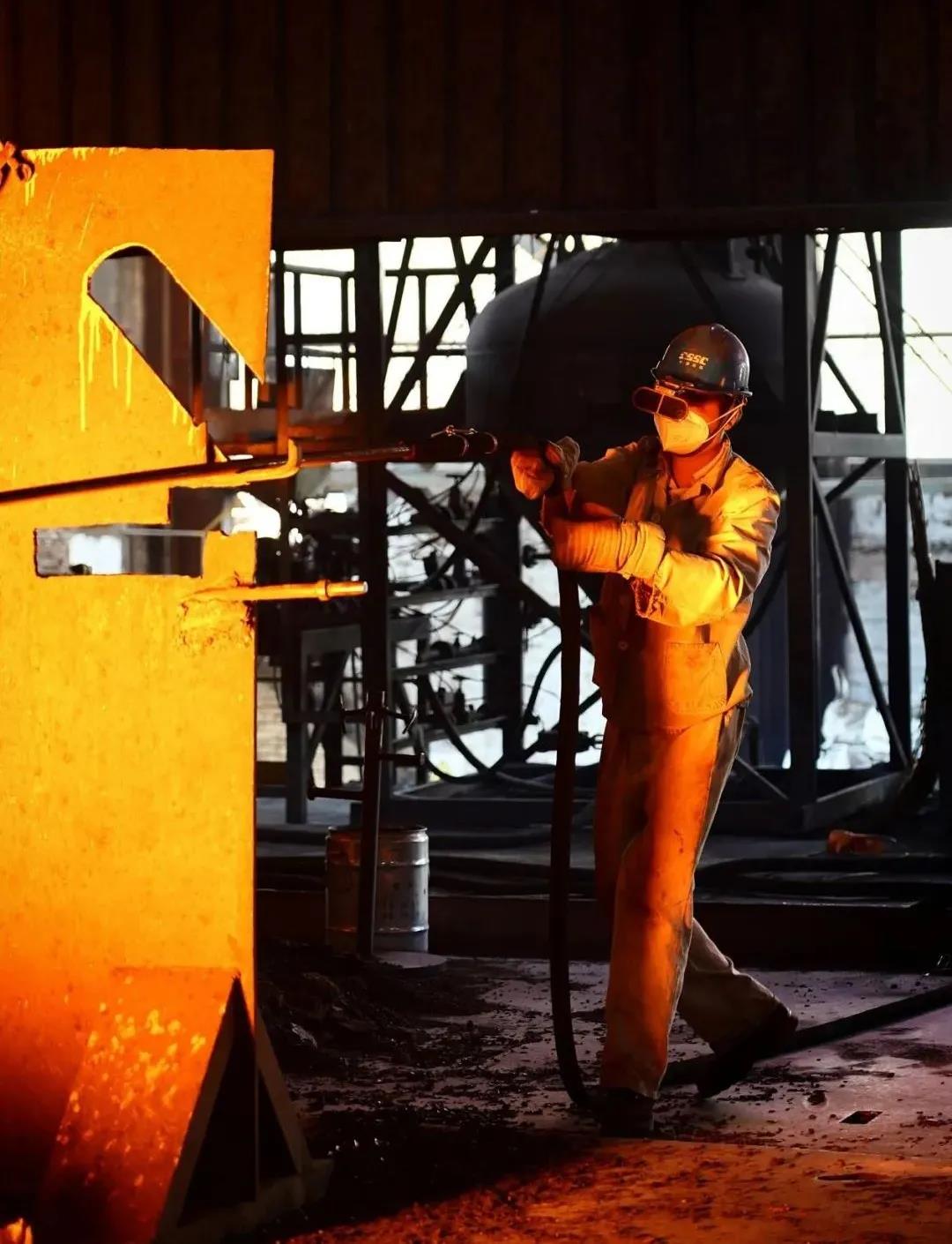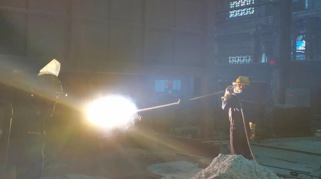 煉鋼工人為確保鋼水質量,提高生產效率進行吹氧工序,鋼水溫度達1600余攝氏度。