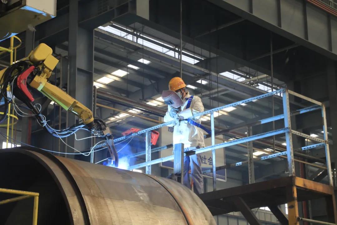 武漢船機鋼構制造部員工正在操作焊接機器人焊接海工產品結構件。