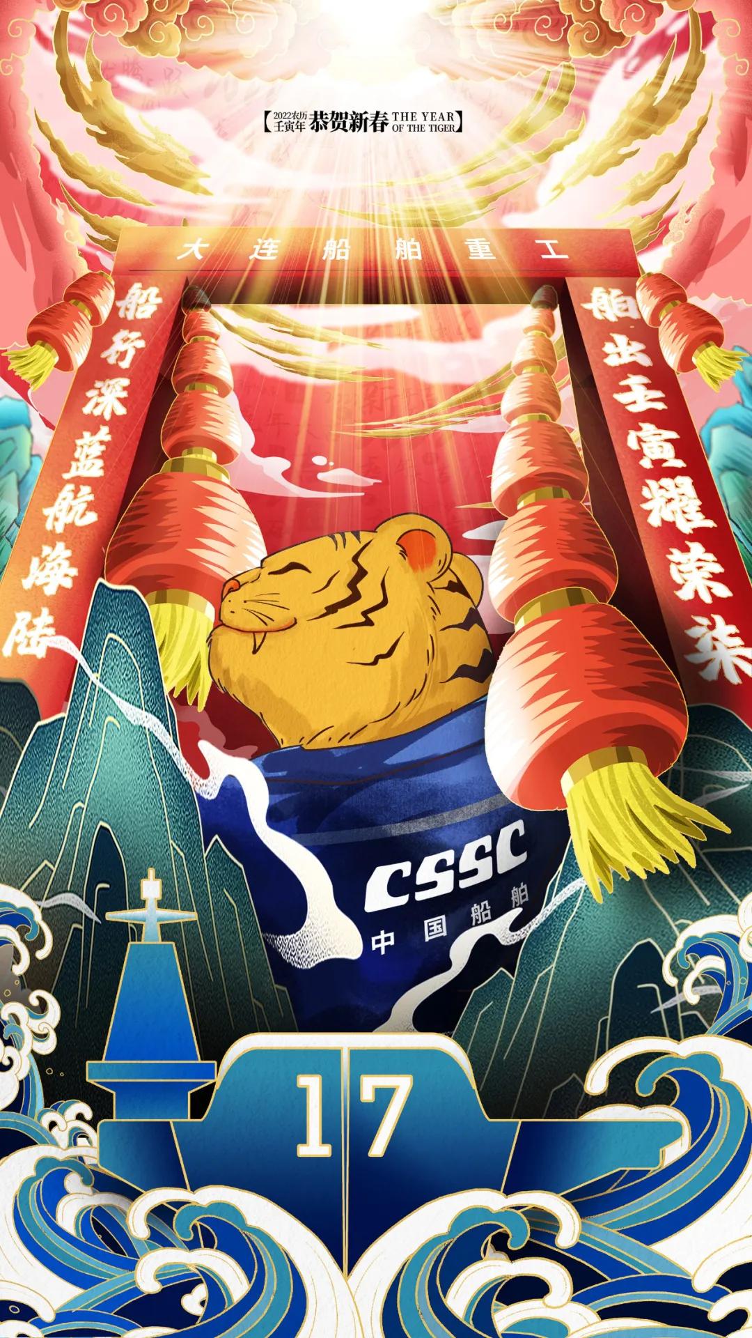 海報采用國潮設計,富有層次感。航海陸對應遼寧艦舷號16,耀榮柒對應山東艦舷號17;兩座山則是對應遼寧半島、山東半島;龍門架將兩座山連接,建造了兩艘航母;龍門架后是漫漫長路;身穿中國船舶服裝的壬寅虎保持自信的微笑,堅定未來路。