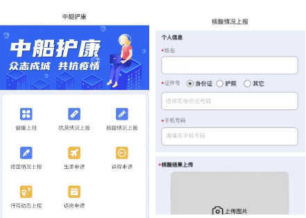 物資公司與樂普(北京)醫(yī)療器械股份有限公司合作開發(fā)的“中船護(hù)康”健康監(jiān)測上報系統(tǒng),具備員工健康上報、抗原檢測、核酸情況、疫苗接種、行程動態(tài)5種上報模塊,以及出差、返程、返崗3類申請,共8大功能,在數(shù)字化防疫方面做出了新的嘗試。