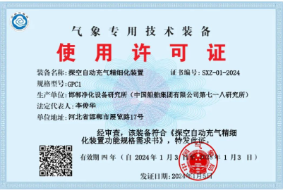 日前,中國船舶集團(tuán)七一八所研制生產(chǎn)的GPC1型探空自動充氣精細(xì)化裝置,成功獲得中國氣象局頒發(fā)的氣象專用技術(shù)裝備使用許可證,成為繼GQD1型自動水電解制氫設(shè)備后,第二個獲此證書的裝置,在氣象領(lǐng)域開拓中邁出重要一步。