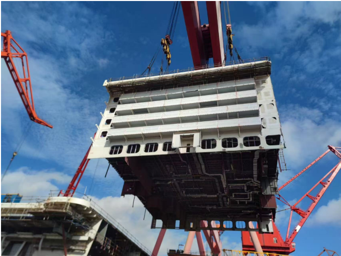 此次完成搭載的U2總段以乘客住艙區(qū)域?yàn)橹鳎缍葹槲鍖蛹装澹青]輪搭載的首個(gè)帶陽(yáng)臺(tái)的總段,其順利搭載是總段完整性建造速度提升和船塢快速搭載的集中體現(xiàn)。