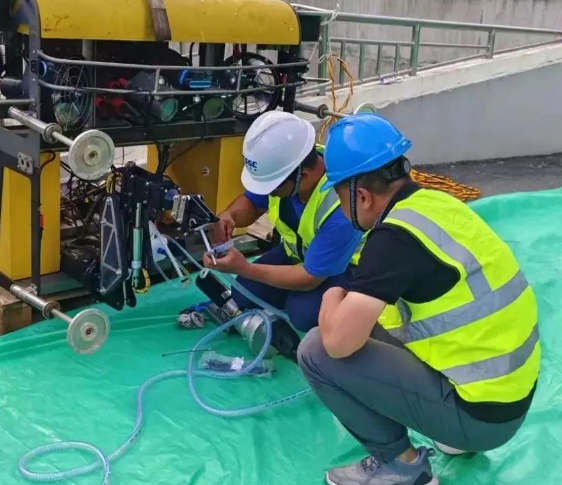 項目組成員克服高溫高濕的環境和艱苦條件,歷時近十天圓滿完成有關試驗任務。本次外場試驗,充分驗證并優化了七〇二所在水下工程領域的核心技術,包括水下裂縫檢測、水下裂縫修復、水下嵌填、水工建筑物表面清理及水下插拔等關鍵技術的實際應用效果與操作效率。