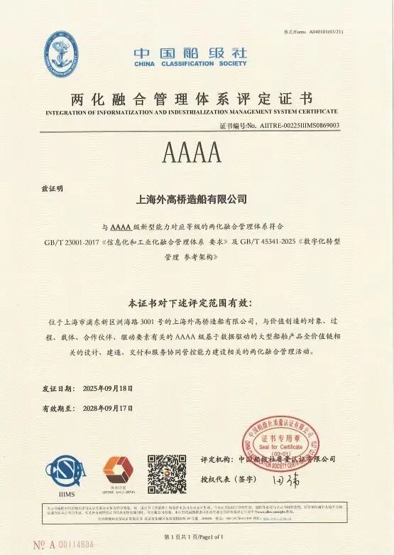 日前,全國兩化融合管理體系評定工作委員會公布兩化融合管理體系3.0和數(shù)字化轉(zhuǎn)型管理體系首批4A/5A級評定企業(yè)名單,中國船舶集團有限公司旗下外高橋造船成為首批29家獲證的企業(yè)之一,也成為首批獲得4A級認(rèn)證的船海企業(yè)。
