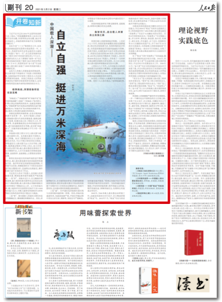 3月2日,人民日報 “開卷知新” 專欄刊發(fā)“蛟龍?zhí)枴笨傇O(shè)計師中國工程院院士中國船舶集團(tuán)七〇二所研究員徐芑南文章《中國載人深潛——自立自強 挺進(jìn)萬米深海》。