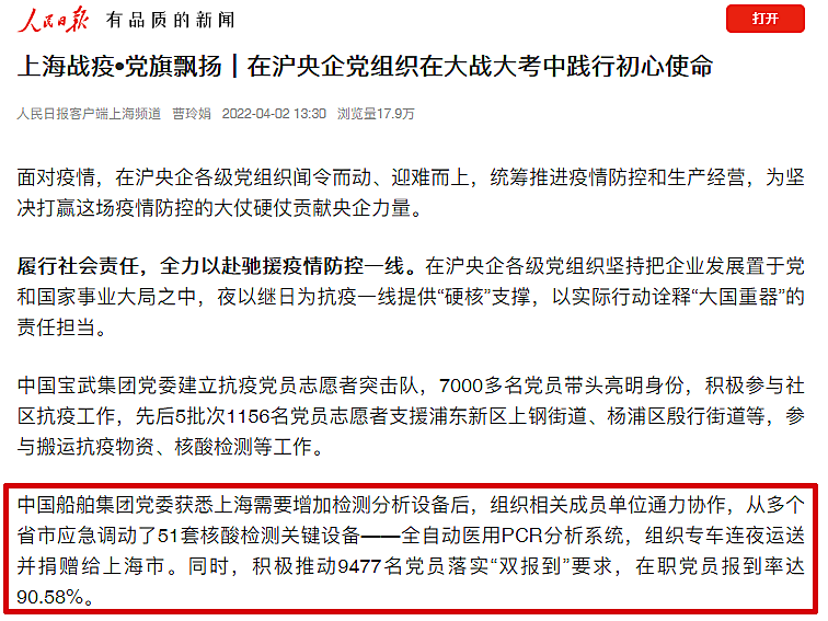 “中國船舶集團黨組獲悉上海需要增加檢測分析設備后,組織相關成員單位通力協作,從多個省市應急調動了51套核酸檢測關鍵設備——全自動醫用PCR分析系統,組織專車連夜運送并捐贈給上海市。同時,積極推動9477名黨員落實‘雙報到’要求,在職黨員報到率達90.58%?!?/p>