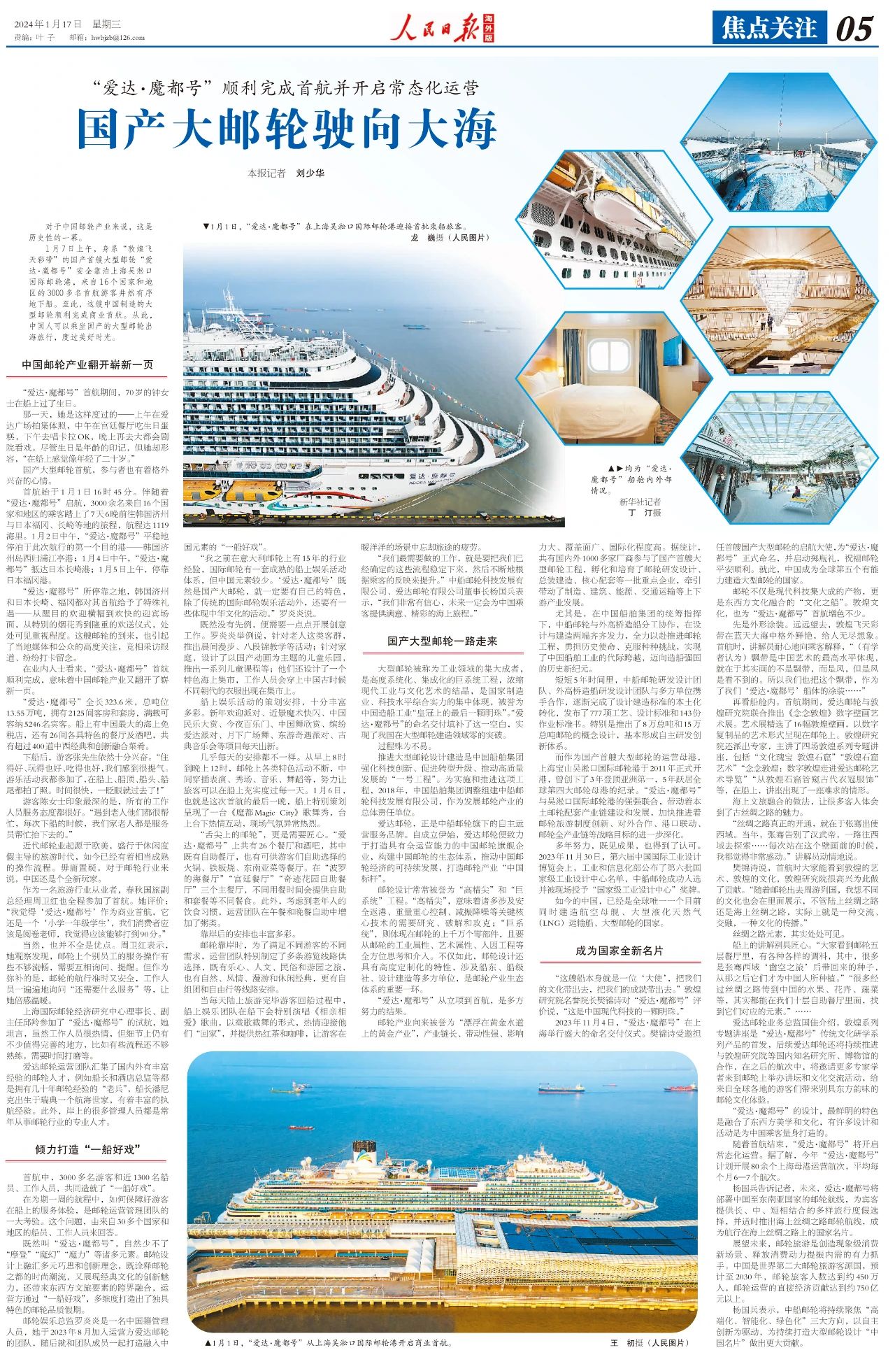 1月17日,人民日報海外版第五版焦點關注刊發整版文章,聚焦“愛達·魔都號”。