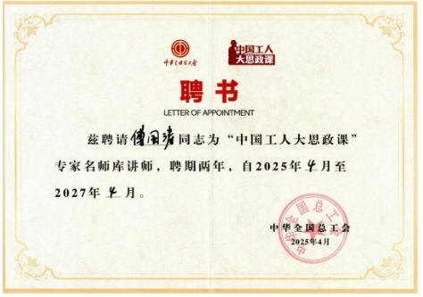 近日,中華全國總工會正式聘請中船集團(tuán)重慶紅江傅國濤為“中國工人大思政課”專家名師庫講師,聘期兩年。這一聘任旨在推動“大思政課”建設(shè)走深走實(shí),發(fā)揮優(yōu)秀人才在思想政治教育中的示范引領(lǐng)作用。