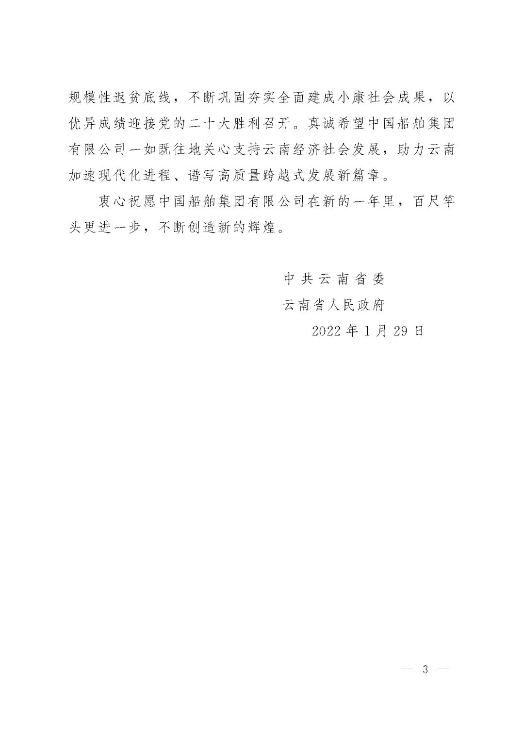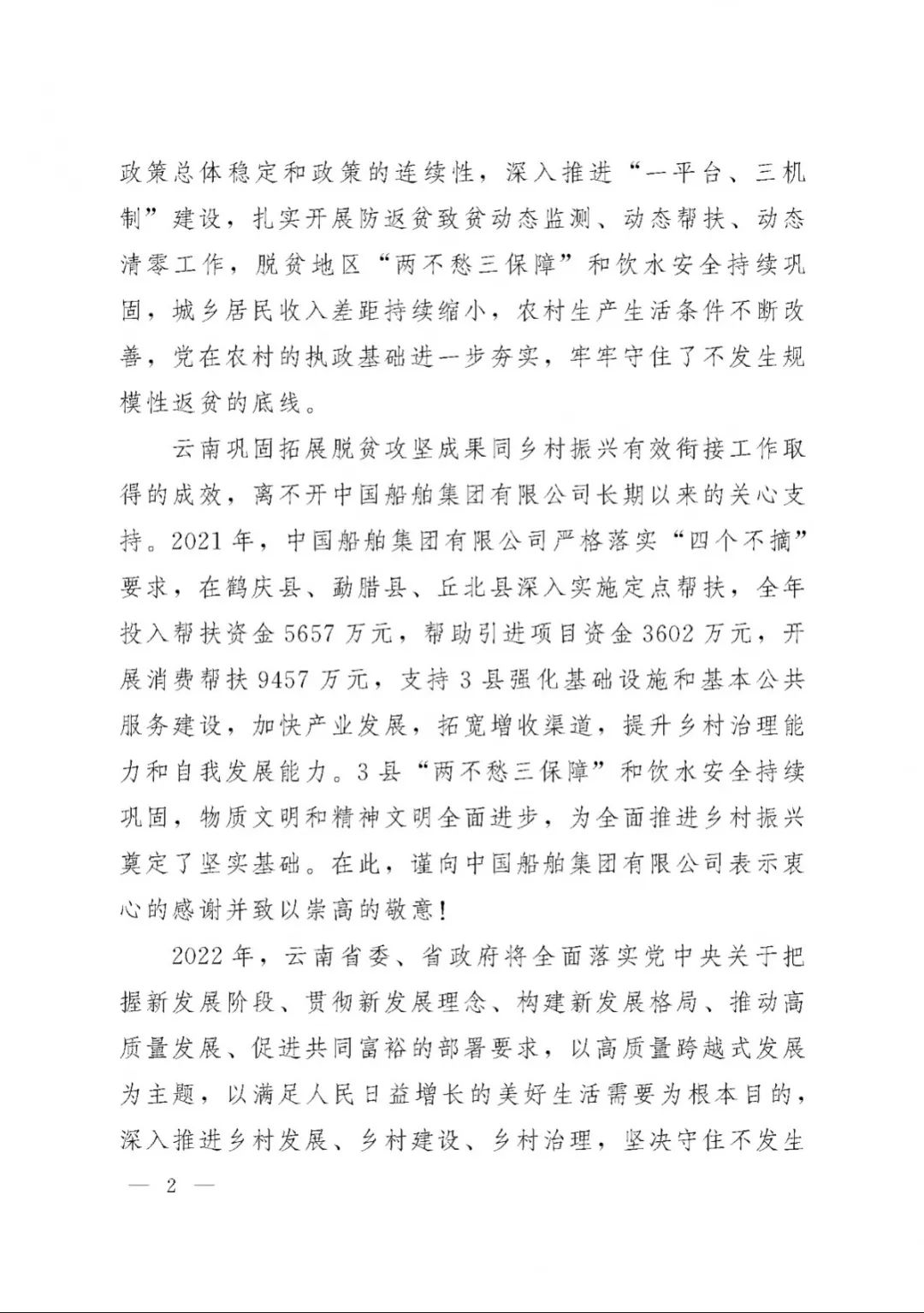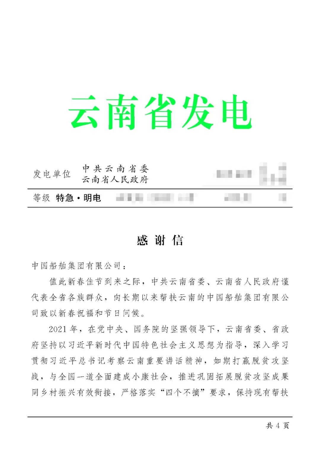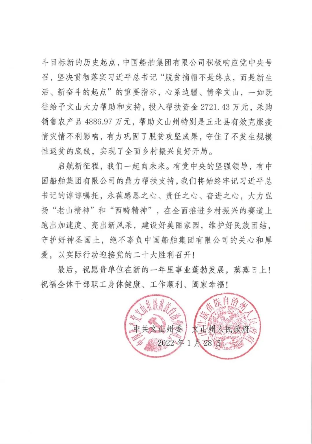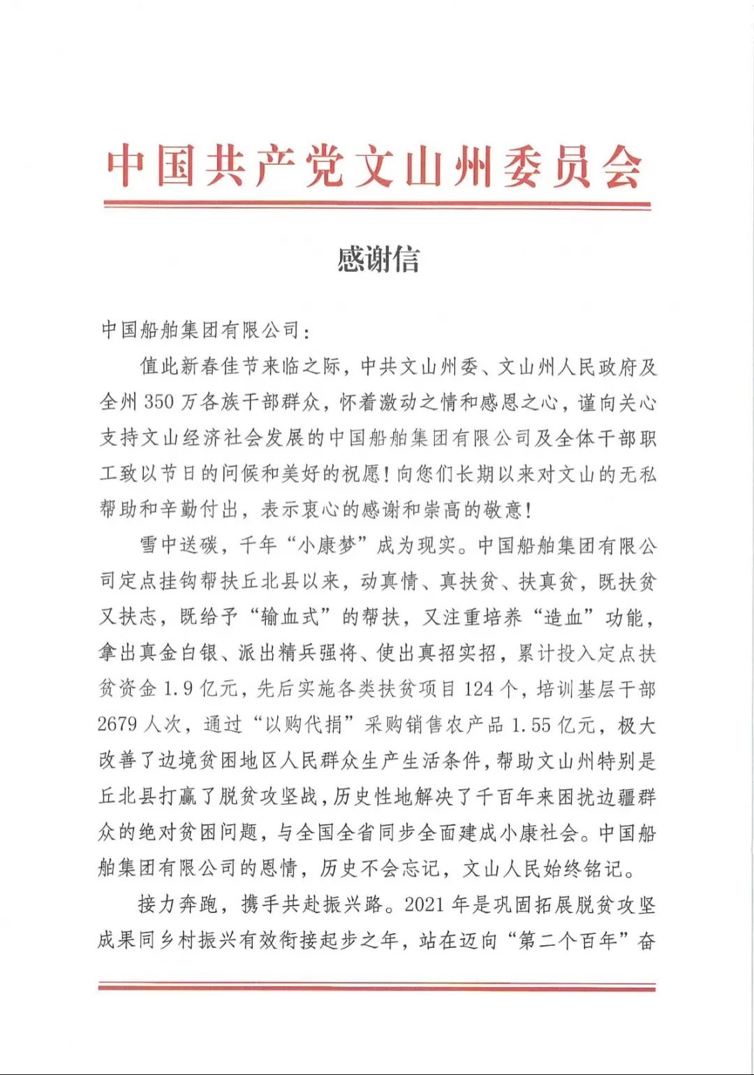 春節(jié)前夕,中國船舶集團(tuán)陸續(xù)收到云南省委省政府、文山州委州政府、鶴慶縣委縣政府、勐臘縣政府發(fā)來的感謝信,對(duì)集團(tuán)公司長期以來給予鶴慶縣、勐臘縣、丘北縣的傾力幫扶表示衷心感謝和崇高敬意。